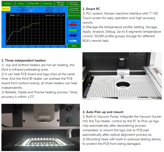 Átdolgozható BGA, PGA, POP, BQFP, QFN, SOT- 223, PLCC, TQFP, TDFN, TSOP, PBGA, CPGA, LED chip.
